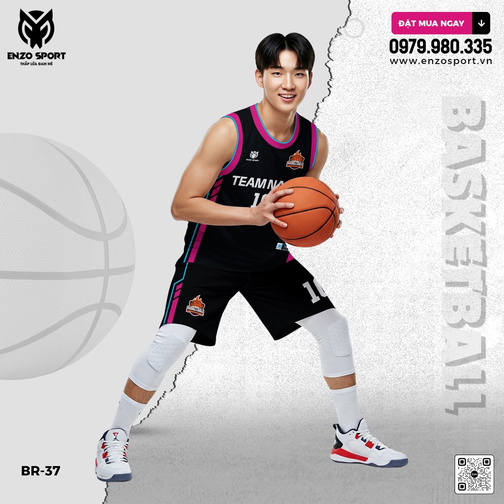 Sản phẩm Đồng phục bóng rổ Enzo Sport BR-37 mang trong mình thiết kế hiện đại với màu đen mạnh mẽ làm nền chủ đạo, kết hợp viền hồng neon và xanh cyan cực kỳ nổi bật. Sự phối màu phá cách này giúp người mặc toát lên vẻ chuyên nghiệp, cá tính và đầy trẻ trung.