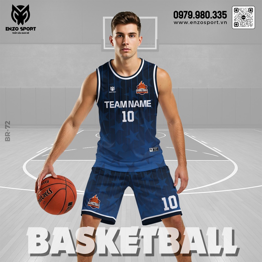 Mạnh mẽ – Cá tính – Chuyên nghiệp: Bộ đồng phục bóng rổ xanh navy đậm với họa tiết ngôi sao chìm và thiết kế tối ưu hiệu suất thi đấu, đáp ứng hoàn hảo cả về thẩm mỹ lẫn công năng thể thao.